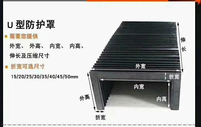 風琴式防護罩用尼龍革、塑料織物或合成橡膠折疊、縫制或熱壓而成,內有PVC板材支撐,可耐熱、耐油、耐冷卻液.